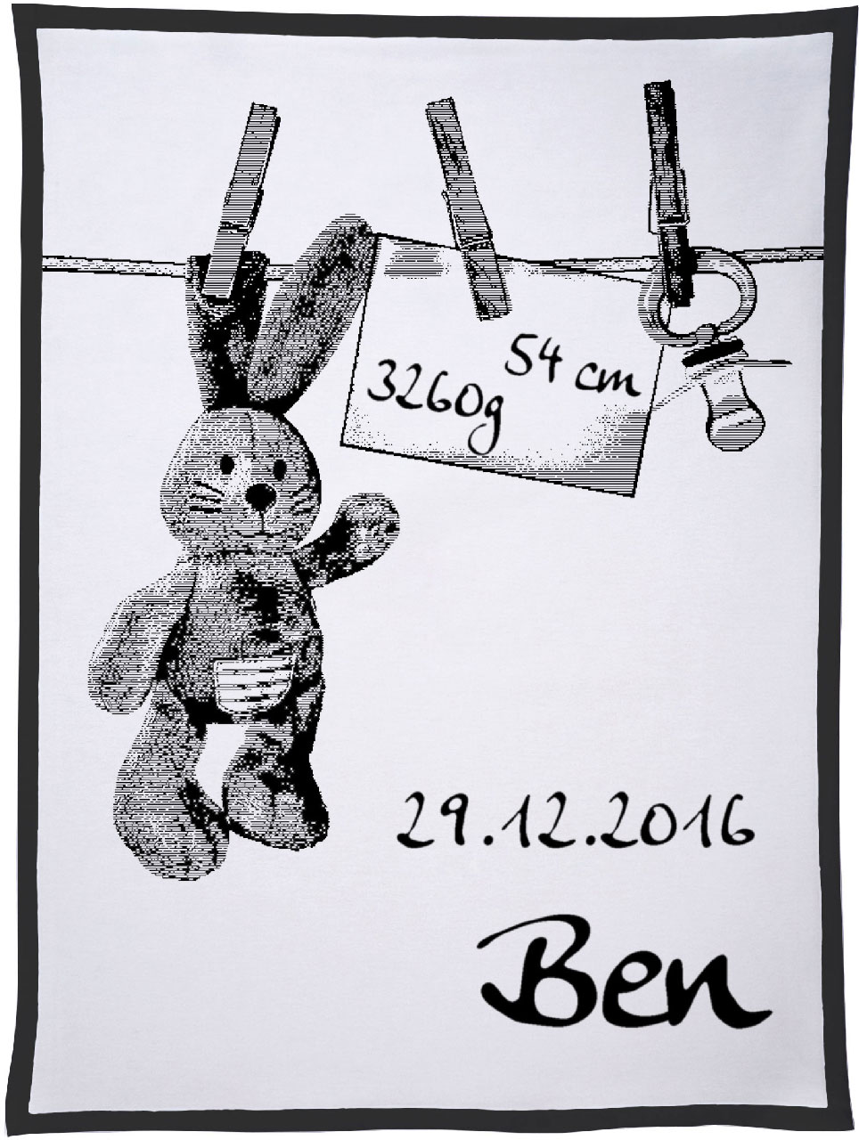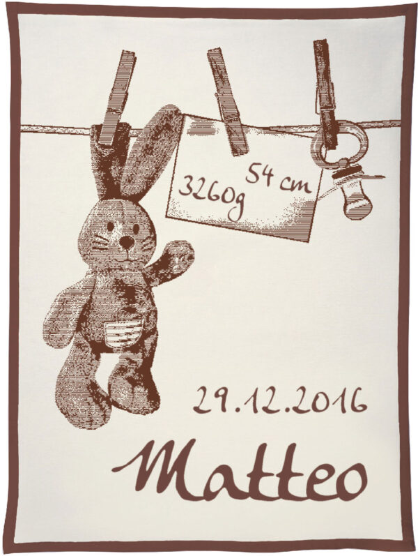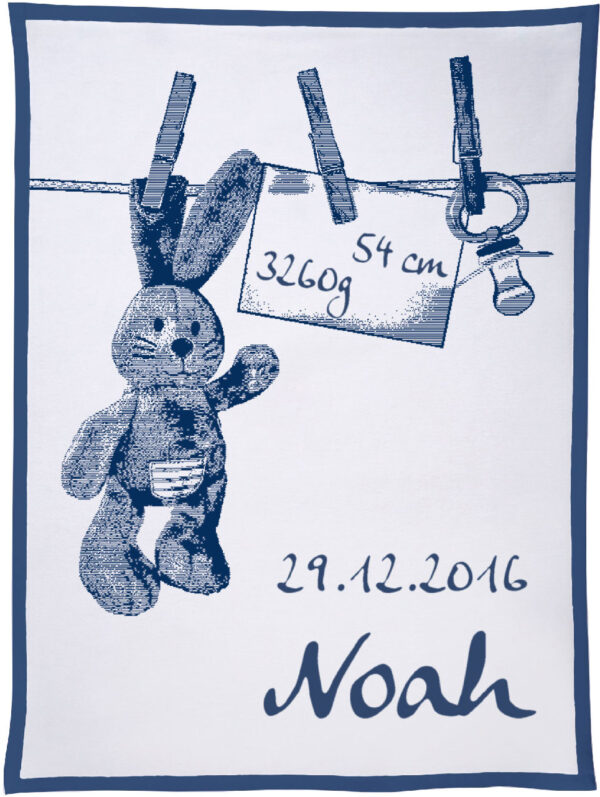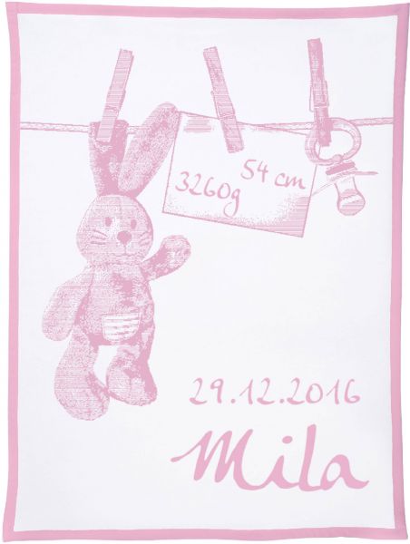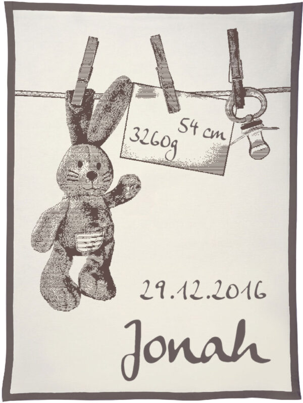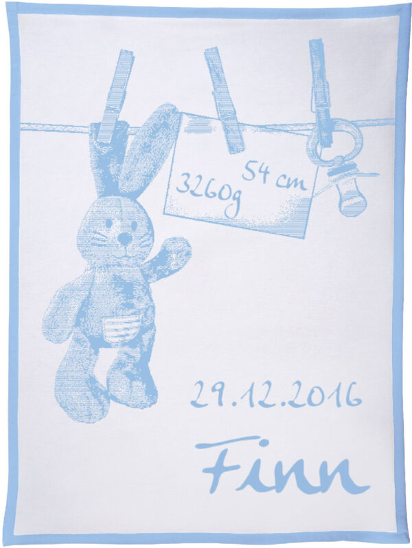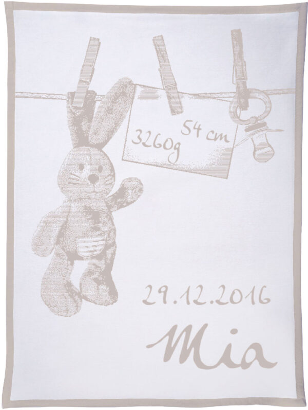 Motiv „Häschen an der Leine“ personalisiert mit dem Namen, Geburtsdatum, Geburtsgewicht und Größe des Kindes gehört mit zu den beliebtesten Decken, die wir als Unicade in unserem Shop anbieten. Unterschiedliche Konfektionsgrößen und individuelle Wunschfarben machen diese Decke zu einem ganz besonderen Geschenk für das Neugeborene und dessen Eltern.